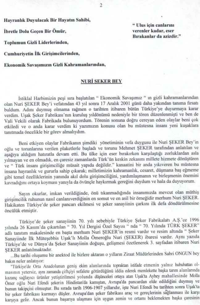 Uşak Vali Mavini Atilla DURMUş'un Nuri ŞEKER Hakkında Yazdığı 17 Aralık 2001 Tarihinde Yazdığı Yazı 2.Bölüm